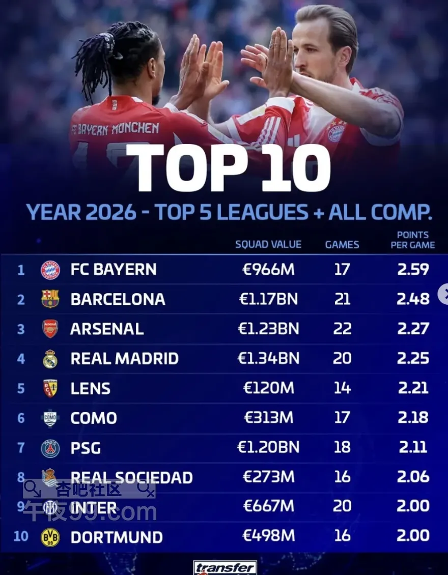 [|心得交流] 本年度各赛事表现最佳五大联赛球队:拜仁、巴萨和枪手前三 |